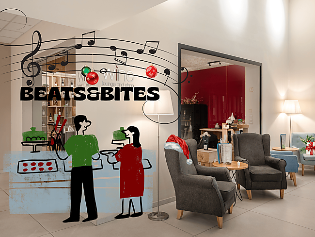 Leckere Snacks begleitet von angenehmer Musik. Die schöne junge Sängerin Nira Casanas Solymosi singt live, während Sie die in der Küche des Weihnachtsmanns gezauberten Köstlichkeiten genießen.