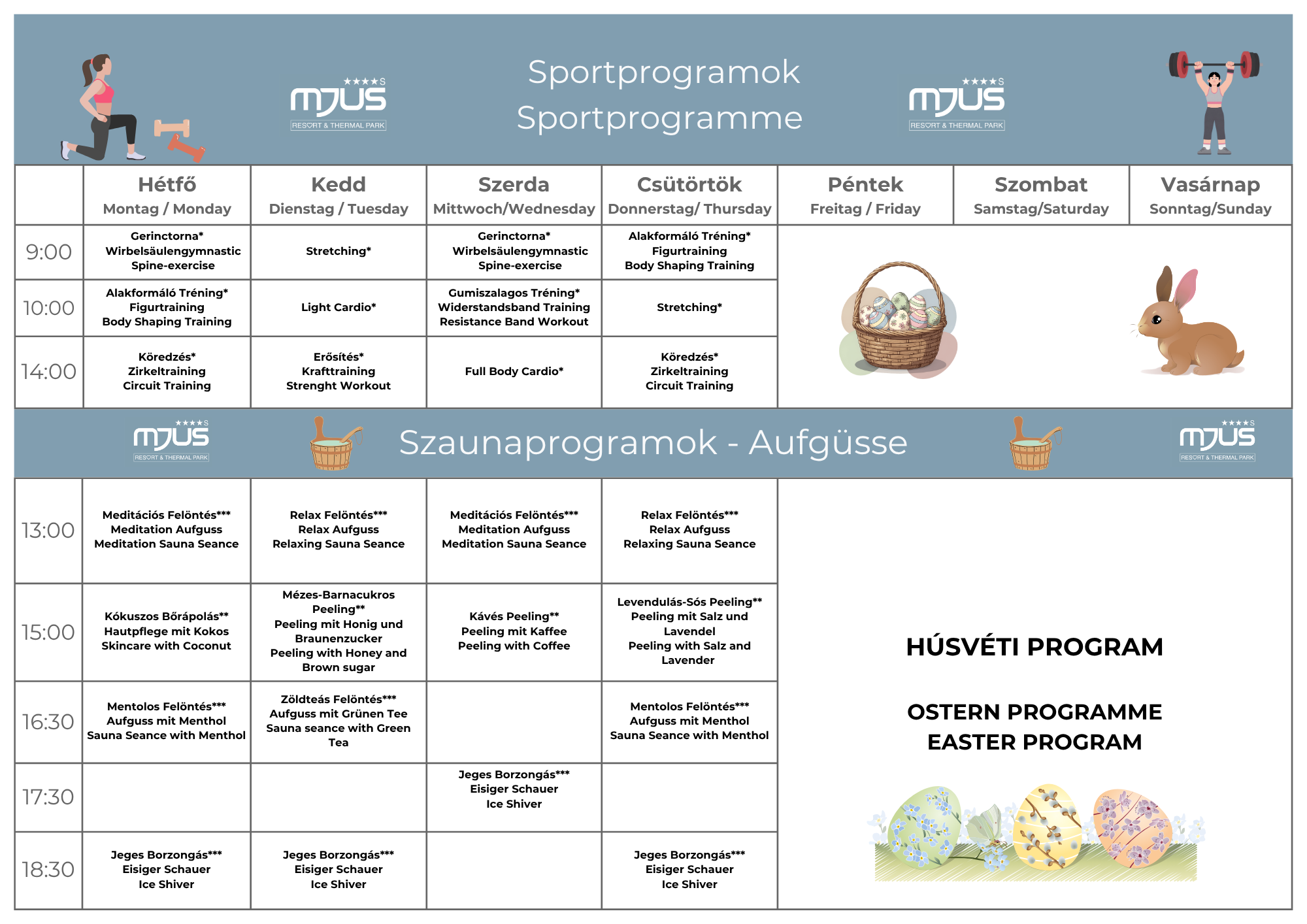 Participation in the programs is free for our hotel guests, but registration is required. You can register for the animation programs at the Thermal Park Reception, and for infusions at the Sauna Reception. Please indicate your intention to participate 15 minutes before the program starts!